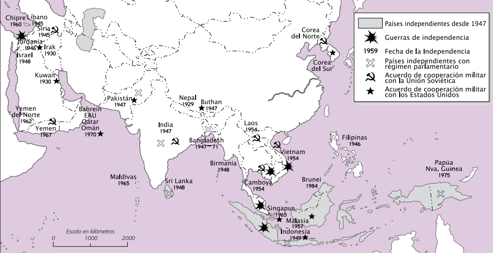 Tras la Segunda Guerra se desencadenó la crisis del colonialismo: continuaron las luchas anticoloniales, donde ya se habían iniciado, y comenzaron, en múltiples naciones de Asia y África. En Asia, la India británica alcanzó su independencia en 1948, también Pakistán, Birmania y Ceilán. Se liberaron Indonesia (colonias holandesas) y las colonias francesas del Líbano y Siria.