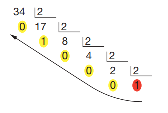 Convertir el número 34 dado en decimal a su equivalente en binario.