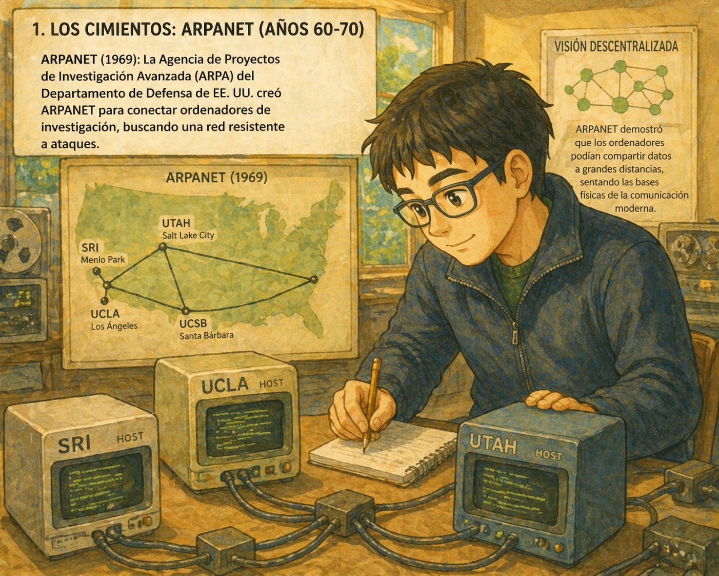 ARPANET (1969): La Agencia de Proyectos de Investigación Avanzada (ARPA) del Departamento de Defensa de EE. UU. creó ARPANET para conectar ordenadores de investigación, buscando una red resistente a ataques.