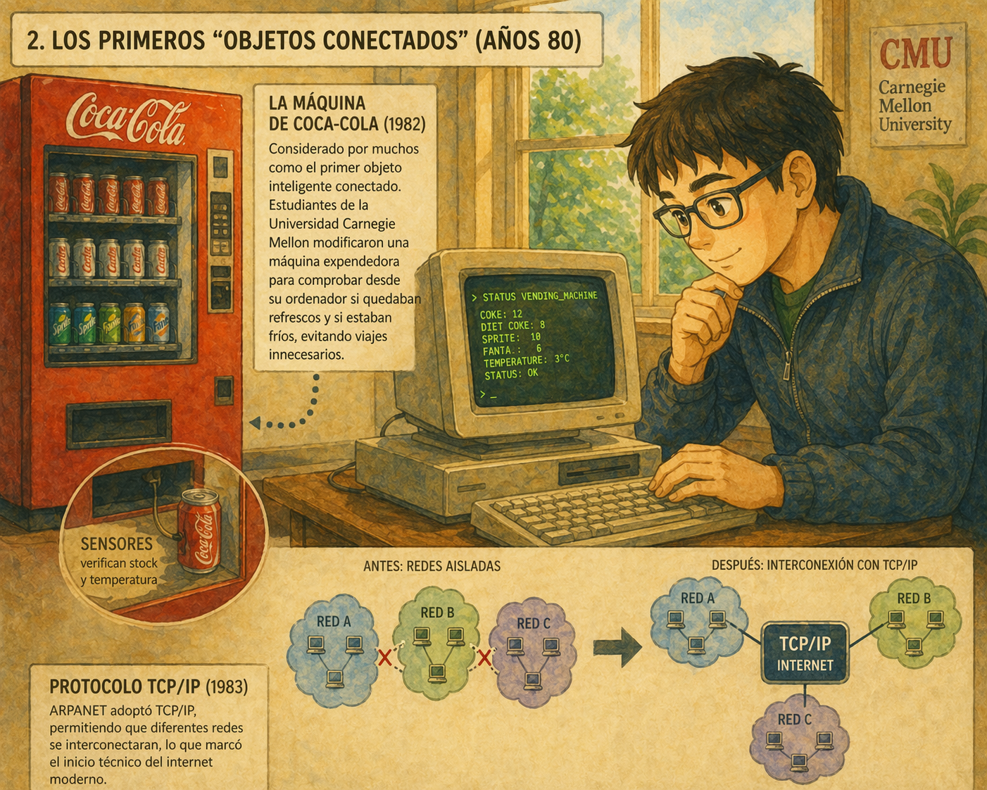 La máquina de Coca-Cola (1982): Considerado por muchos como el primer objeto inteligente conectado. Estudiantes de la Universidad Carnegie Mellon modificaron una máquina expendedora para comprobar desde su ordenador si quedaban refrescos y si estaban fríos, evitando viajes innecesarios.