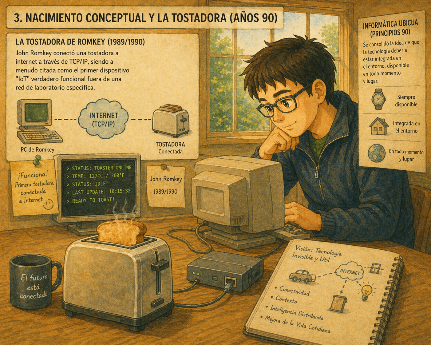 La Tostadora de Romkey (1989/1990): John Romkey conectó una tostadora a internet a través de TCP/IP, siendo a menudo citada como el primer dispositivo «IoT» verdadero funcional fuera de una red de laboratorio específica.