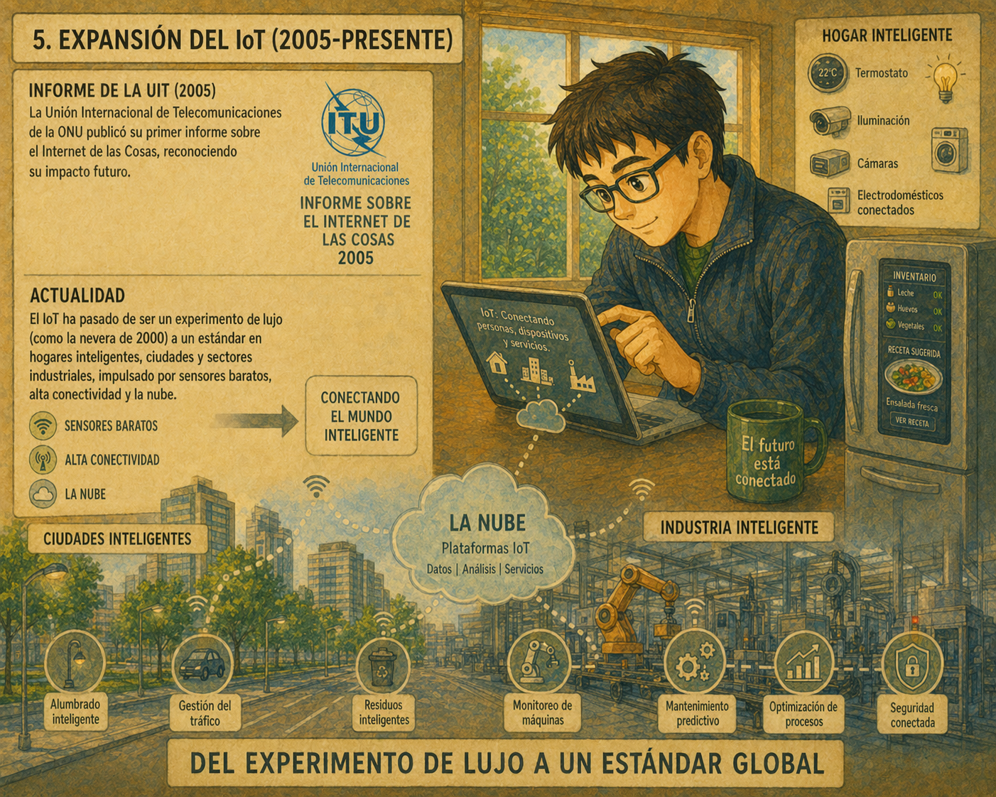 Actualidad: El IoT ha pasado de ser un experimento de lujo (como la nevera de 2000) a un estándar en hogares inteligentes, ciudades y sectores industriales, impulsado por sensores baratos, alta conectividad y la nube.